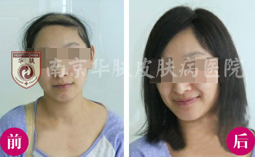 “当时来的时候,头发稀稀的,她是戴假发来的,是那种波波头。”阿美就是一个典型的普秃患者,本该是一个美女。2015年4月26日,她来到南京华肤皮肤病研究所就诊,上面的两张初诊实拍照片就是她病情的真实记录。