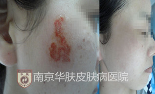 邻居看到陈女士的脸部都已经溃烂状态,推荐她到南京华肤皮肤病研究所检查,治疗。通过检查,诊断出王女士面部的患的症状是带状疱疹,针对这个病情,接待主任陈永芳主任,采用了一套适合陈女士的“中西医结合疗法”,经过1天治疗面部肿胀及眼睑浮肿即明显减轻,水泡缩小,经过2次治疗后疼痛基 本消失了。表皮有热感,面部浮肿已基本消失,带状疱疹基本消失,没有在复发。