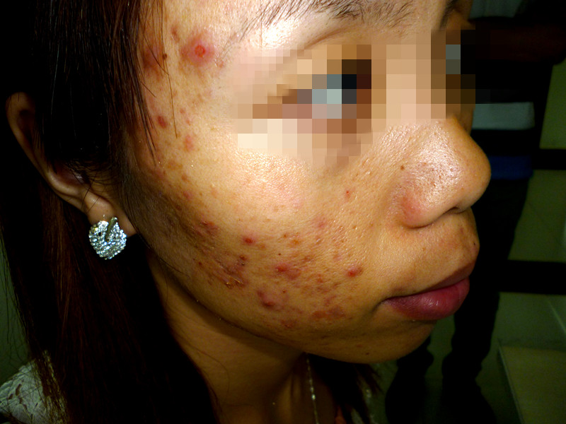 患者满脸痤疮三年多,曾经去专科医院就诊,服用清热解毒的西药、药膏内服、外用半年,略能控制,但新增腹痛、腹泻,停药后痤疮就会复发,前往美容院做美容护理,效果一般,精神压抑,备受折磨,痤疮更加严重。