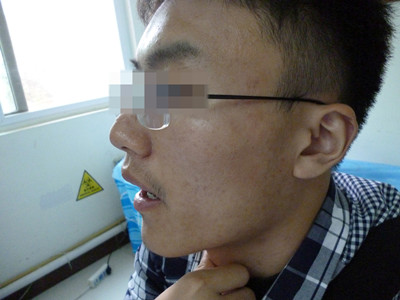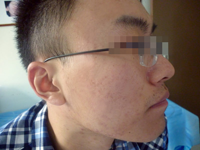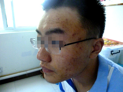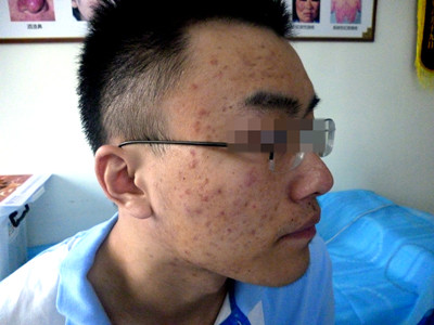 患者男性,杰成(化名)20岁,是南京某所高校的学生。在校期间经常熬夜,慢慢的脸上就长了很多痘痘,杰成根本没放在心上,因为他这个年纪每个班级都会有几个长痘痘的,但是他万万没有想到,仅仅一年的时间,脸上的痘痘就变成了大大地脓包,又红又肿,整张脸“惨不忍睹”,同学们都不敢直视,同学们都纷纷在背后议论他,这让自尊心很强的杰成根本无法接受,开始变得暴躁,情绪低落。用过很多外用软膏,效果一直很不理想,对皮肤没有什么改善。到各大医院就诊,给予中成药、外用药(药物不详),病情未见缓解。面部脸颊两侧有大量红色小丘疹,并伴有脓疱,大小不等的结节,位于皮下或高于皮肤表面,呈淡红色或暗红色,质地较硬。夏季天气炎热的时候症状尤为明显,皮肤油脂分泌较多。