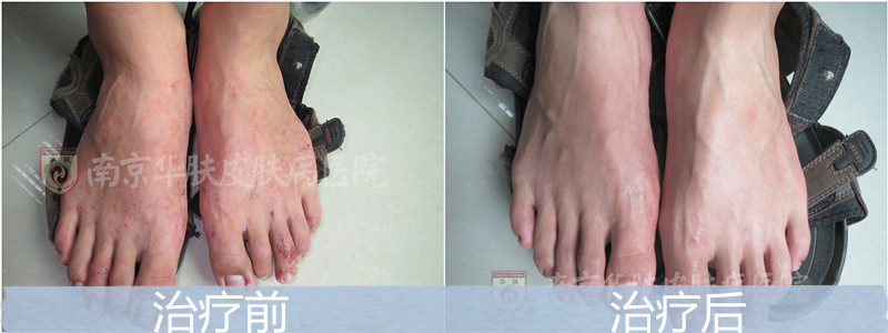 于是2016年1月15日这一天,张先生抱着试一试的心态,来到了南京华肤皮肤病研究所就诊。医院专家详细询问了病情后,发现其双脚肿胀已经严重影响行走,并伴有角化皲裂,糖尿病病史,根据患者的情况,医生开出了适合病人体质的药方,中药内服,加以西医快速止痒,提高免疫力,中西医结合,对病源进行调理。15天后,2016年1月31日,张先生过来复诊,情况明显好转,双脚皮损基本改善,可以说治疗效果非常显著。