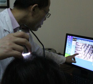 南京华肤皮肤病研究所利用300倍率的尖端毛囊检测设备,高倍镜5H检测,电脑-毛发/肤质检测,可以准确检测患者的毛囊细胞。